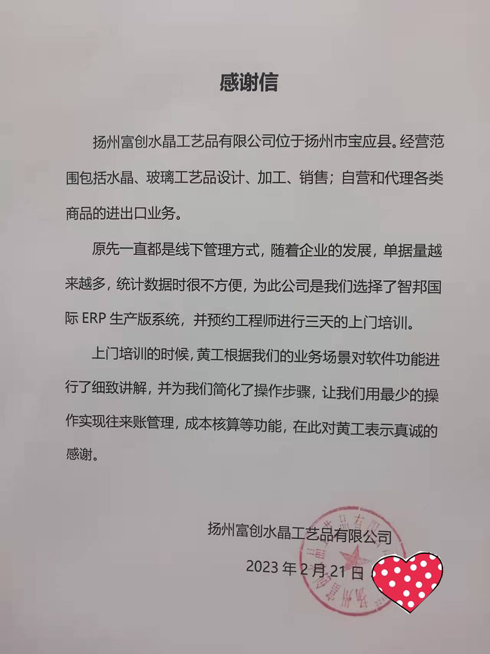 近日,扬州富创水晶工艺品有限公司签约智邦国际,希望通过智邦国际ERP系统的使用,实现销售部与生产部一体化管理,订单流转无缝衔接,智能降本增效。
