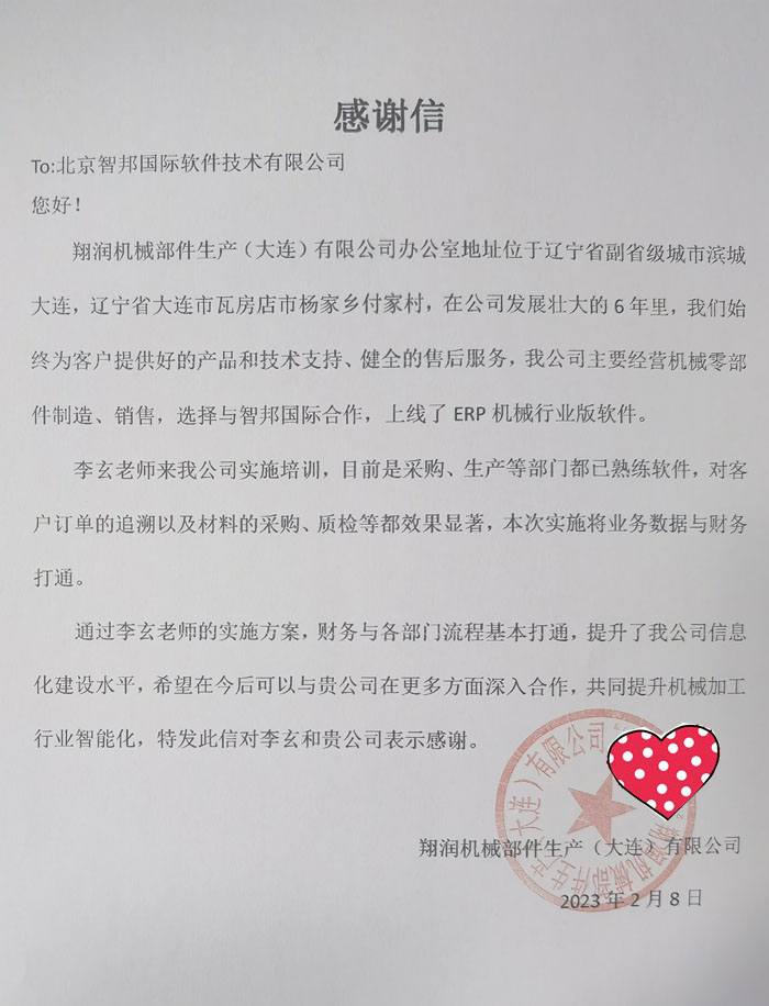 近日,翔润机械部件生产(大连)有限公司签约智邦国际,希望通过智邦国际机械行业管理系统的使用,构建实时共享的信息管理平台,提高数据传递的及时性、准确性,让生产高效进行,决策精准科学。