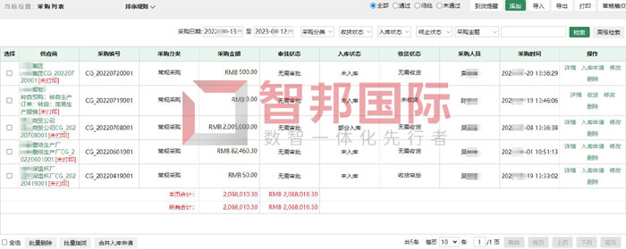 在智邦国际ERP系统中,预购和询价可互转形成采购单,预购和询价也可直接形成采购单,灵活满足多种采购管理场景。系统可视化采购列表,一个界面集中呈现全部采购信息,系统支持批量删除、批量指派、合并入库申请等操作,简化复杂的操作步骤,大大提升办公和管理效率,节约大量的时间成本。