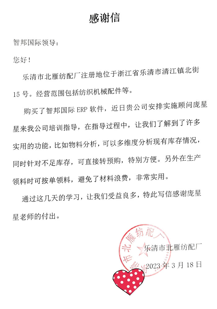 ERP系统是一个整合了专业的信息技术和管理思想的现代企业信息化管理系统。相信通过引进智邦国际ERP系统,北雁纺配厂能够实现智能化生产管理,高效配置企业内部资源,减少不必要的生产损耗。