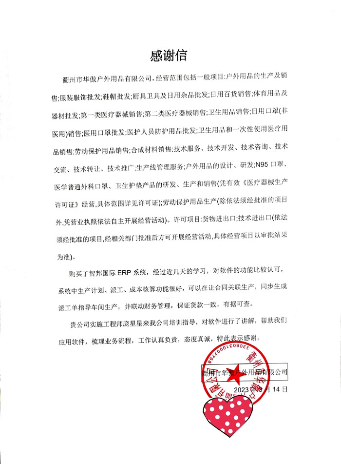 企业健康发展离不开科技加持。相信通过引进智邦国际ERP系统,华傲户外用品能够在一个平台上实现一站式管理,打通各环节任督二脉,提高企业运行效率。