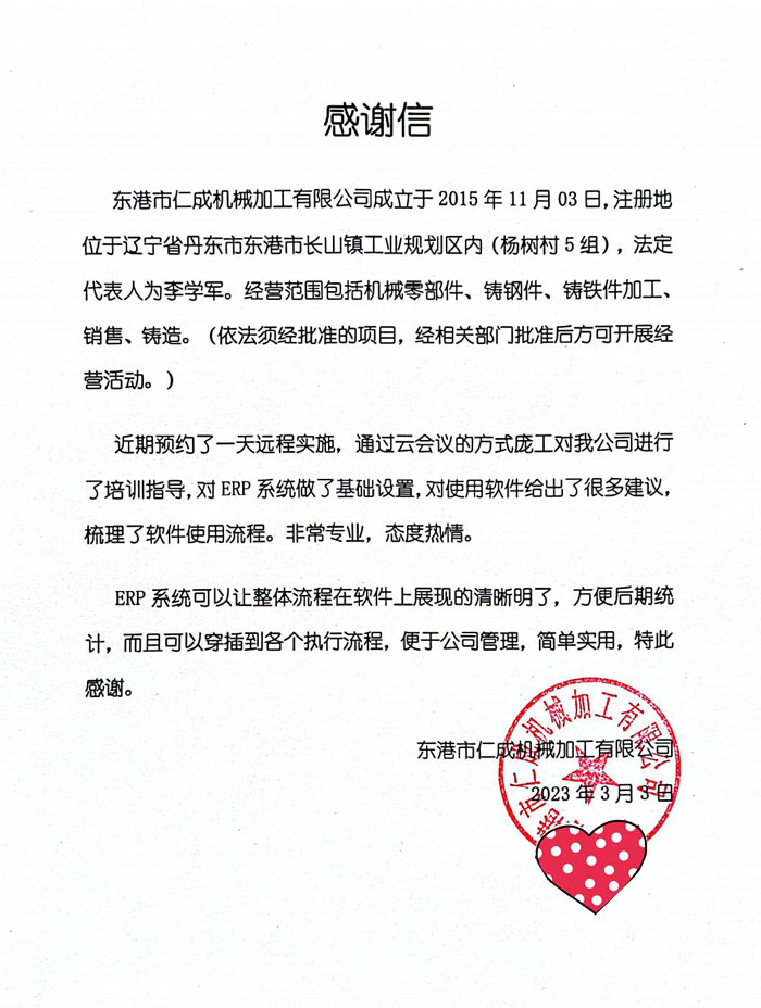 近日,东港市仁成机械加工有限公司签约智邦国际,希望通过智邦国际ERP系统的使用,覆盖整个公司运营的管理工作和流程,做好企业可持续发展的长久布局。
