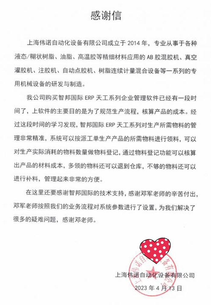 ERP系统对于企业管理发挥着积极作用。相信通过引进智邦国际ERP系统,伟诺自动化设备能够实现业务数据的智能采集、动态分析,达成智慧生产。