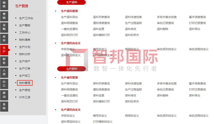 除此之外,智邦国际ERP系统物料管理功能还包含生产退料管理、生产废料管理、物料登记、领料剩余等管理模块,帮助企业建立可视化生产车间,透明化生产过程中的物料路径,企业可根据自身业务需求,灵活设置物料领、补、退、废审批流程,对生产物料进行有效管控,节约生产成本。