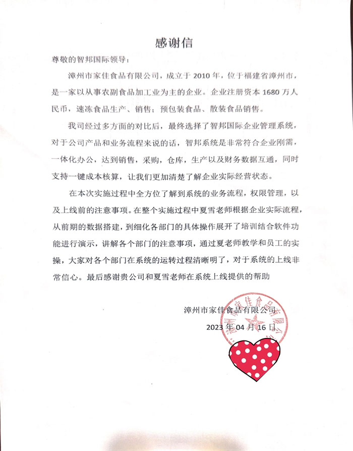 近日,漳州家佳食品有限公司签约智邦国际,希望通过智邦国际ERP系统的使用,打破各区域、各部门、各岗位之间的沟通协作壁垒,打通企业信息孤岛,巧解生产管理难题。