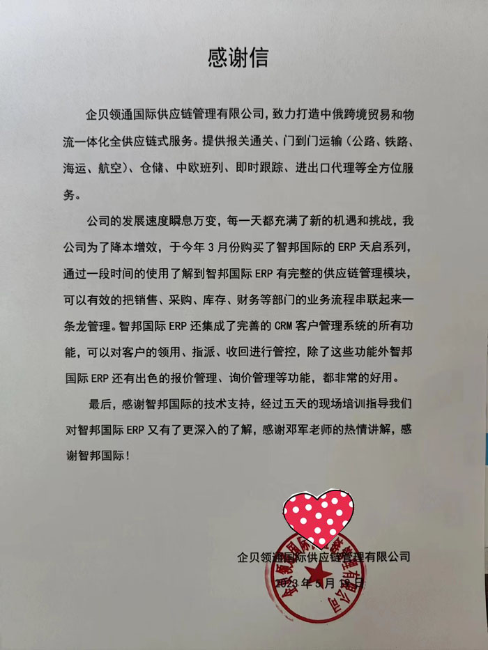 企贝领通向智邦国际送感谢信