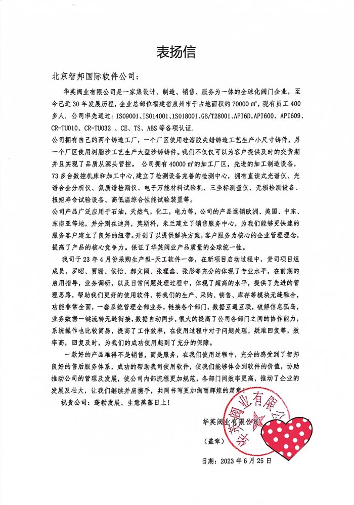 近日,华英阀业有限公司签约智邦国际,希望通过智邦国际ERP系统的使用,在一套系统里解决全部管理难题,数据一次录入全面应用,提高各环节协作效率,保障企业高效运转。
