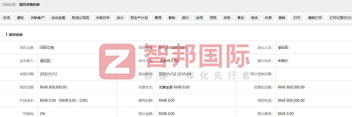智邦国际ERP系统支持在线项目添加,项目信息、洽谈进展等数据一目了然,项目可关联1个父项目和多个客户,可一键转设计、预生产计划、费用、报价、合同、预购、采购、售后等环节,打通各环节协作沟通壁垒,提高工作效率。在系统中,项目信息可一键共享、复制、打印、删除等,操作简便,省时省力。