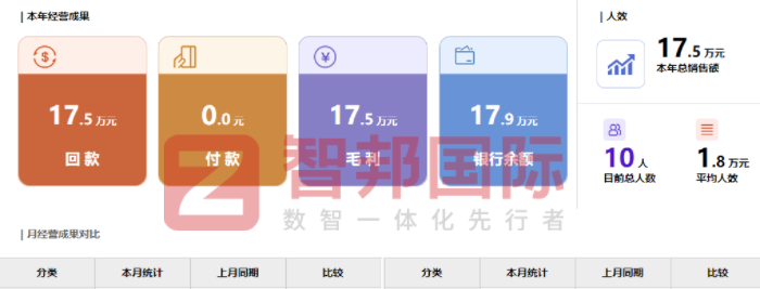 智邦一体化ERP天时系列为企业提供了总览全局的宏观视角。以销售团队管理为例,老板控制台功能页面可以自动将销售数据汇总,将年度经营成果、月度经营成果对比,以及人效等有相关信息清晰呈现。回款数据、利润数据、人效、新增客户、收款金额等一目了然。管理者可轻松透视数据找到销售团队在各个维度的业务问题,及时纠正并给出正确指向。因其底层数据无碍流转,故汇总数据准确,科学发挥一体化管理优势价值。