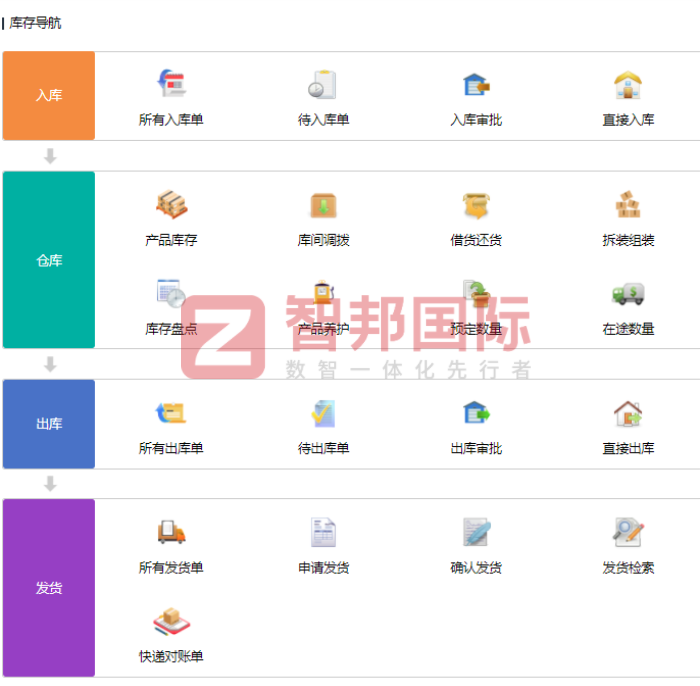 智邦一体化ERP天工系列为企业提供了全面的库存管理功能。库存管理涉及的管理流程繁杂,出入库、库间调拨、货品盘点、发货等业务流程下是大量且复杂的数据流转。在系统内,库存管理不但能够为企业灵活管理各项流程数据,还能够通过库存管理的数据情况反映企业运营管理的问题,为企业指明需要调整和改进的管理方向。例如,库存预警数据呈现了仓库中的货品存在超量或者缺量的情况,企业需要减少某个货品的采购或者及时补货。全面准确地库存管理,不但减少了某些不必要的库存成本,还提高了库存管理效率。