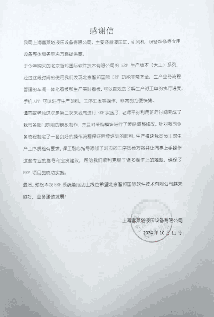 无论是着眼于当前的运营需求,还是规划长远的发展蓝图,企业都应当将防范和消除信息孤岛问题视为一项至关重要的任务。相信通过引进智邦一体化ERP天工系列,富莱塔液压设备能够在一个统一的平台上,实现各业务板块、部门以及员工之间的无缝集成管理,从而持续强化并提升企业的核心竞争力。